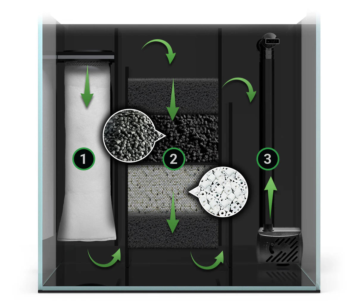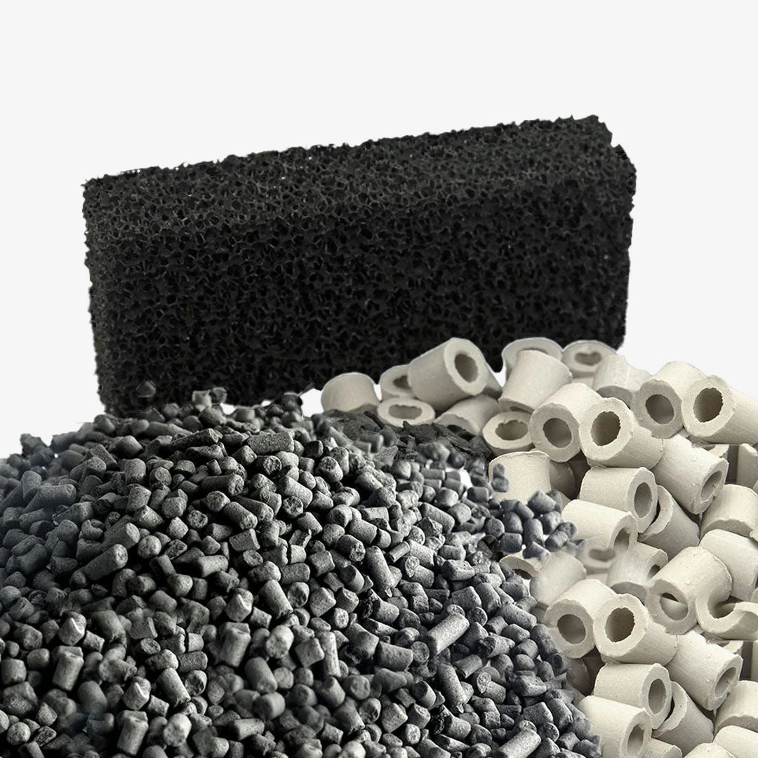 Carbon removes discoloration, organics and toxins from the water. Ceramic rings provide surface area for beneficial bacteria to grow. Sponges break up any bubbles in the system and will trap any larger debris.