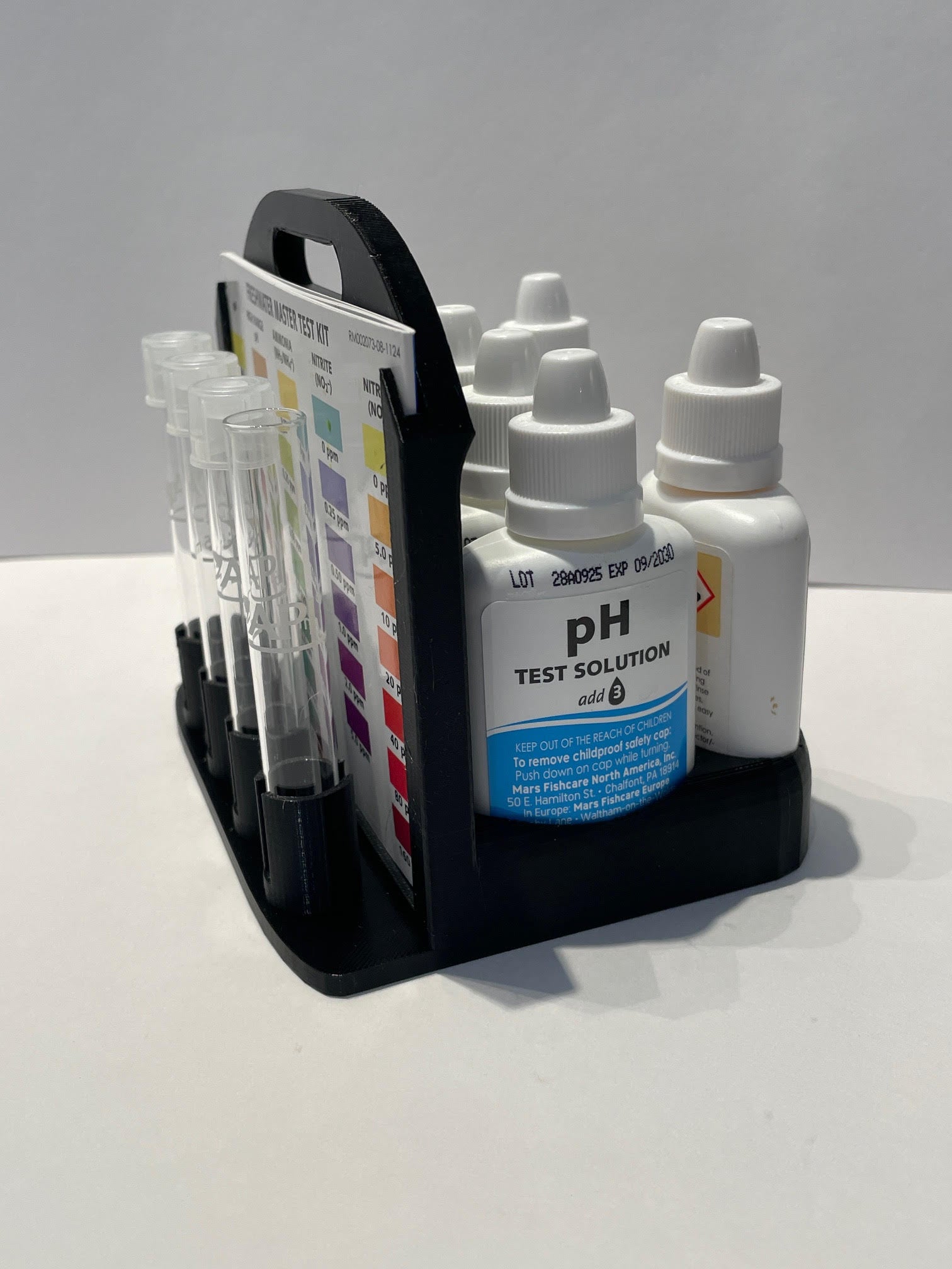Keep your API test kit neat and ready to use. This 3D printed holder is designed to fit standard API test tubes and reagent bottles, keeping everything upright, organized, and easy to grab during water testing. It also allows easy comparison of the color chart with the tubes held steady.