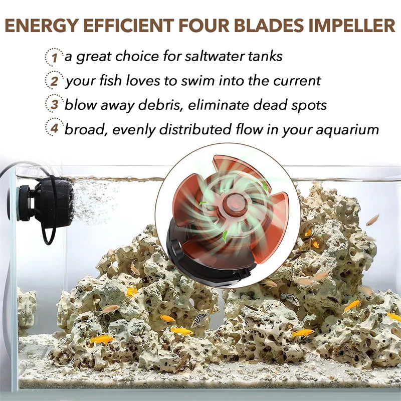 Designed by Brushless Motor and Sine Wave technology, the hygger DC wavemaker pump has a powerful 4-blade impeller, it moves around aquarium water and helps debris sucked up by the filter, keeping water clean and mimicking natural current to let your aquatic pets swim smart. It’s so quiet that it won’t disturb your sleep when in use in the bedroom. The high GPH wavemaker for 55–150 gallons of saltwater freshwater and coral reef tanks.