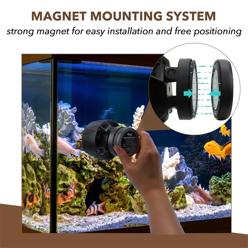 The aquarium DC wavemaker pump comes with a magnetic holder for easy installation, free positioning in aquariums without getting hands wet, and 25-degree magnetic swivel brackets for direction of water flow, it provides directional water flow precisely where you need it most. The pump is compact and easy to hide behind rocks/decorations/plants, it is recommended for tank glass thickness up to 3/5” (15mm).
