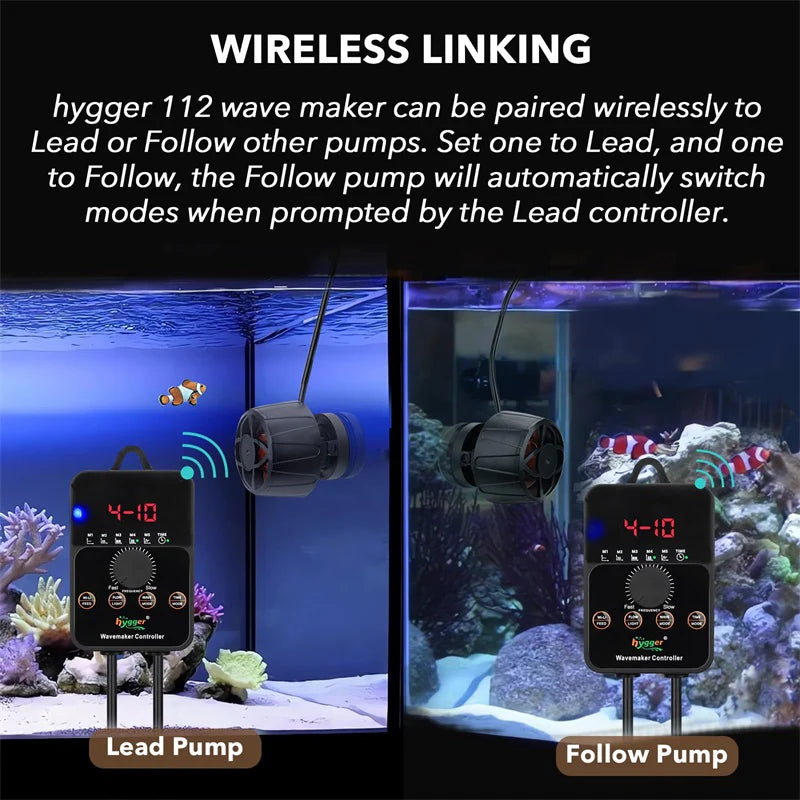 The external controller provides control of wave mode, flow rate, frequency, and scheduling for custom 24/7 mode and quick set single mode, one-touch 10 minutes feeding mode, a nighttime sensor that automatically slows the flow of the waves when the tank’s lights go off and wireless linking to sync and control multiple wavemaker pumps in aquariums