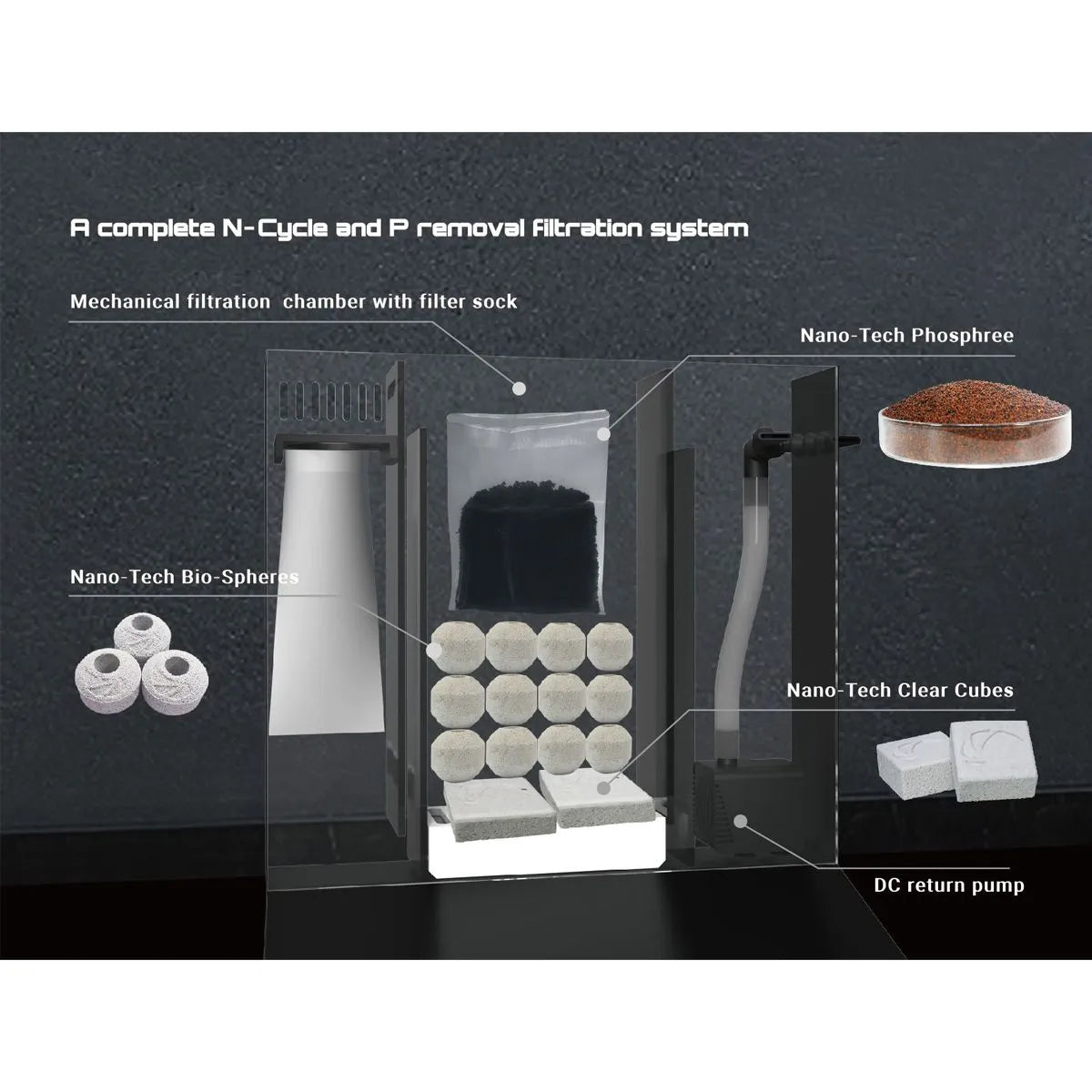 Included with the Dice Cube AIO is a starter supply of mechanical, biological, and chemical filtration media. The Nano-Tech PhosPhree is a phosphate absorbing resin that reduces PO4 slowly, preventing sudden drops which can shock your system. The Nano-Tech Clear Cubes are a unique ionic media based from the cystalline mineral tourmaline, which helps to clarify aquarium water and combat algae growth by breaking down dissolved organic matter. Also included are 12 pieces of Nano-Tech Biosphere balls for fostering beneficial bacteria growth and one nylon filter sock for capturing and filtering organic solids.