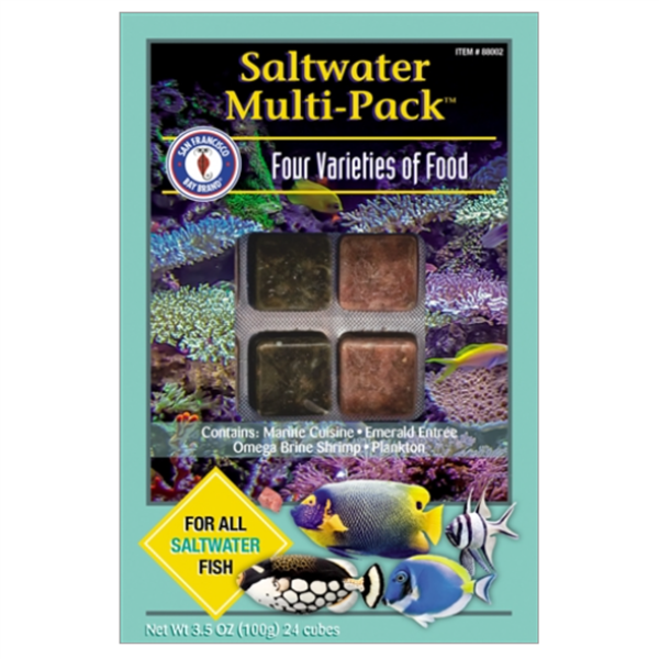 Four Varieties of Food For All Saltwater Fish Saltwater Multi-Pack™ is four varieties of food in one package! It contains six cubes each of Marine Cuisine™, Emerald Entrée™, Plankton, and Omega Brine Shrimp in a convenient cube package with a foil cover to prevent freezer burn. These foods provide essential nutrients that help maintain high energy levels and vigor in your fish. |