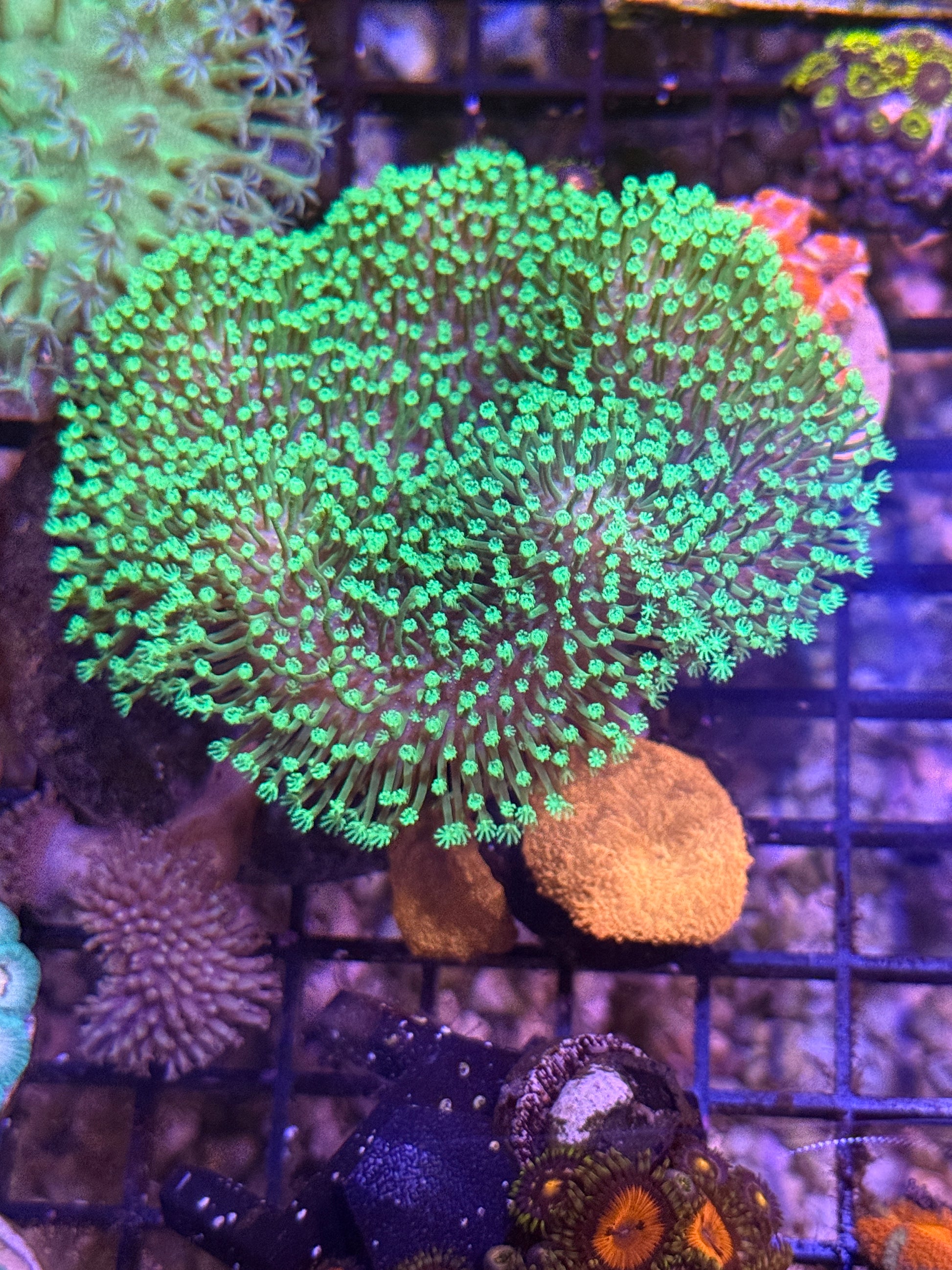 WYSIWYG Large Crown Colony Neon Toadstool with 3 Jawbreaker mushrooms attached. Images are under natural white light with some blue. Toadstool head is 4-5" across The 3 jawbreakers 2 are approx. 1" and one a little smaller. These will usually grow into having Reds and Green, see other listing for Jawbreakers I have to see what they look like bigger.