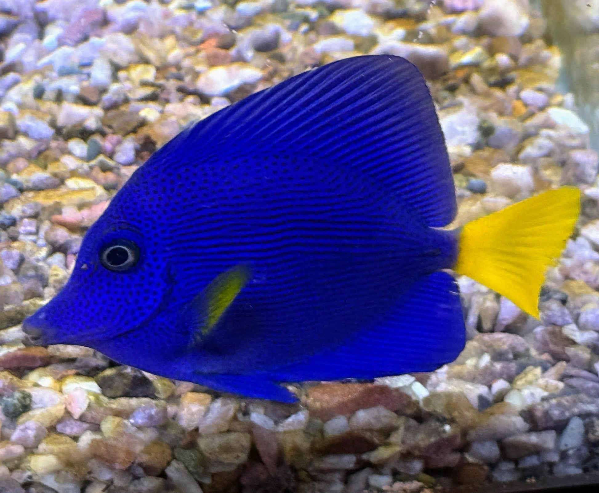 WYSIWYG 2.5-3" Purple Tang that has finished quarantine and is eating flakes / pellets.